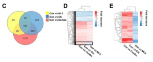 Clicking on the center of the graph shows the gene set, and a heat map is shown. 59 genes showed different trends (shown in the box in Figure 3D). M treatment was down-regulated and C treatment or M + C treatment was up-regulated. The researchers then wanted to screen out the genes with different trends, as above.